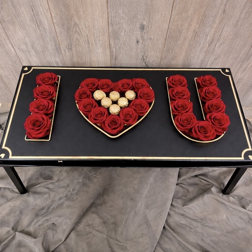 Two dozen lush red roses arranged to impress, with a couple of indulgent Ferrero Rocher chocolates nestled at the center for a sweet, romantic surprise.